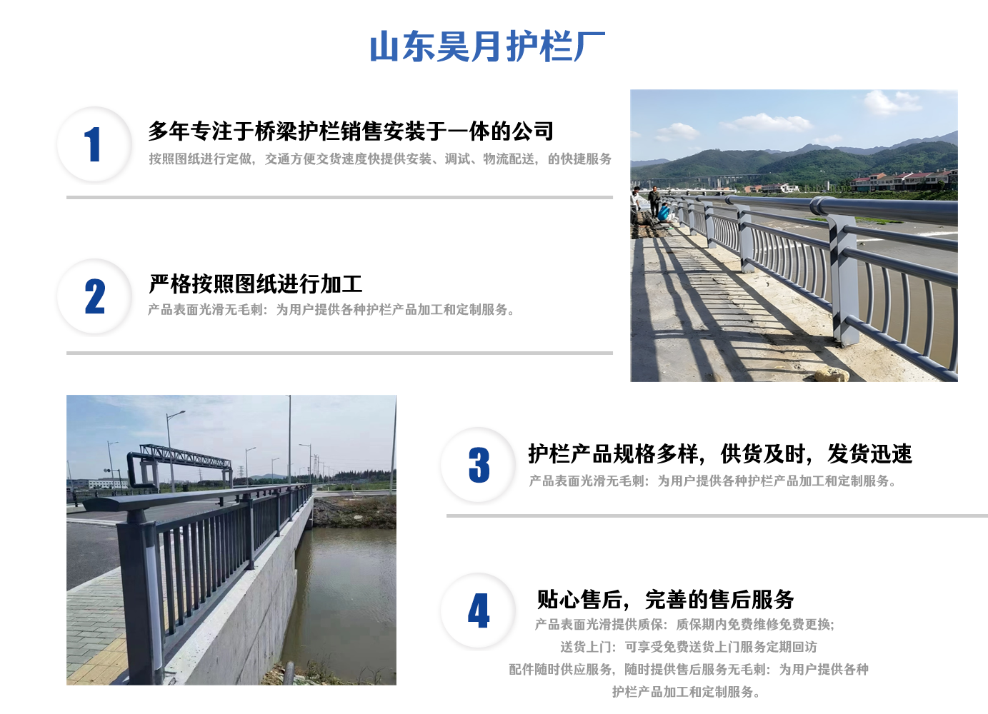 Company Profile山東昊月金屬制品有限公司坐落于原材料豐富人文和諧交通發(fā)達及有“江北水城”之稱——聊城。 公司以科技興廠為宗旨,積極引進人才和技術,不斷開拓創(chuàng)新. 主營產(chǎn)品:SS級橋梁防撞護欄,不銹鋼復合管護欄,鋁合金護欄,燈光護欄,河道護欄等等。產(chǎn)品本公司建立了一套科學的行之有效的質(zhì)量體系,擁有一支高技術、高素質(zhì)團隊,堅持以“誠信”為本,堅持“優(yōu)質(zhì)的質(zhì)量、貼心的服務”為崇高理念,為用戶提供質(zhì)優(yōu)價廉的產(chǎn)品提供至真至誠的服務。與客戶合作雙贏、攜手共創(chuàng)輝煌。 公司以科學的工藝、嚴格的質(zhì)量管理、完善的服務理念、合理的銷售價格贏得了良好的聲譽,建立了密切和愉快的合作關系。多年來,我們一直以良好的品質(zhì)、合理的價格,完善的質(zhì)量保障體系,完善的售后服務為客戶提供周到的服務,滿足廣大客戶的需求。 我們以信譽求生存,以質(zhì)量去競爭,以真誠換合作,以效益求發(fā)展,是我們的服務宗旨。我們積極主動與同行加強交流與時俱進,邁向新的歷程!我們竭誠歡迎您的咨詢和洽談,愿與同行業(yè)的同胞們合作共贏。...